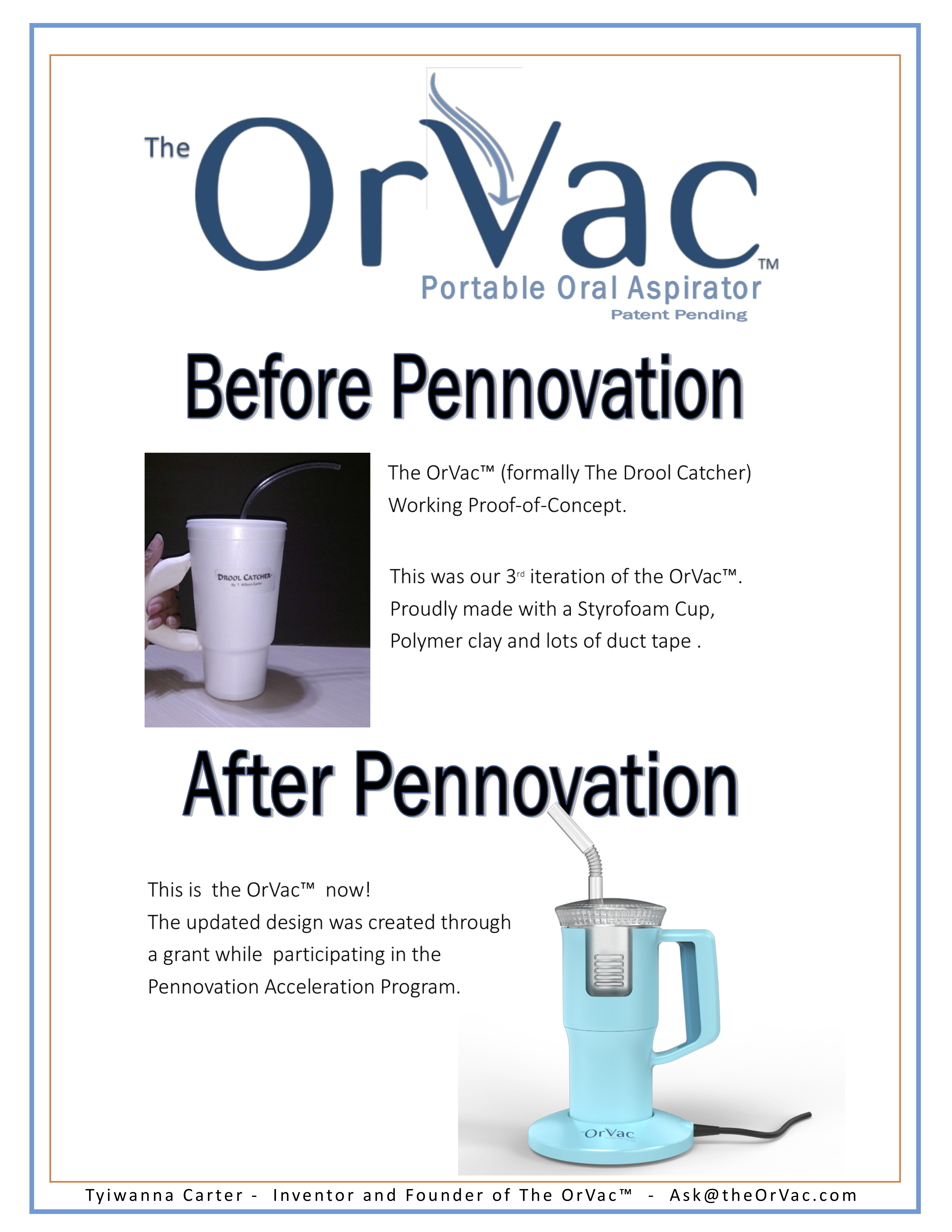 “The Pennovation Accelerator made me into a Founder,” Carter shared. “I am an inventor, I created The OrVac™ (formally The Drool Catcher) to help my mother, and as most inventors do, I had blinders on. I just wanted to make my product. Being a part of the program made me a founder and taught me to concentrate on the business, not just the product.”